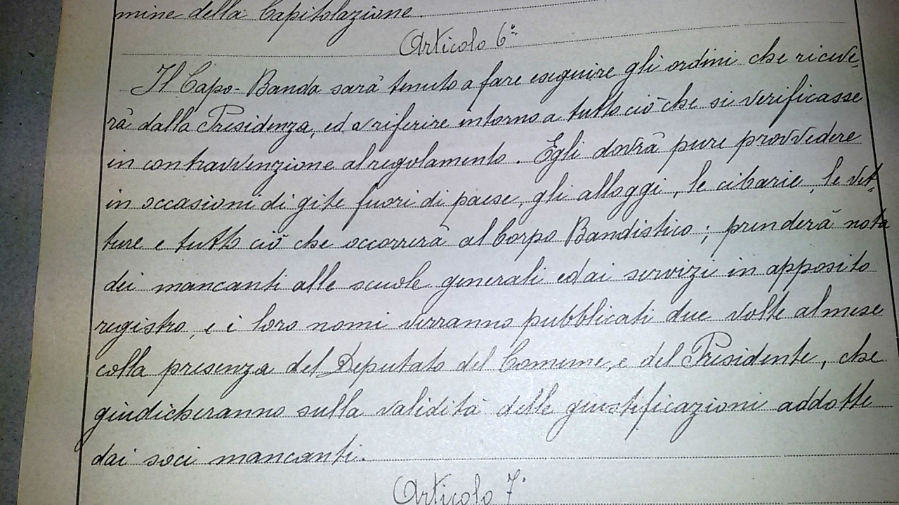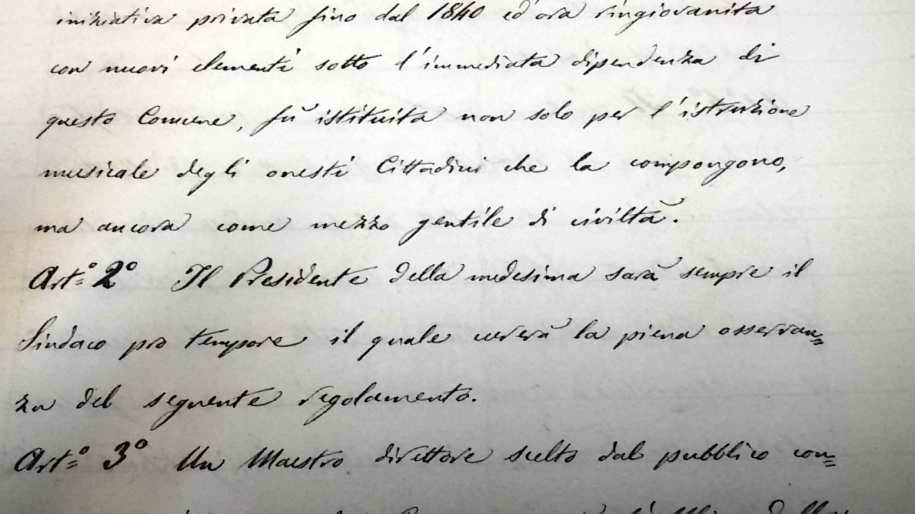 L’accentramento burocratico e il rigido controllo statale che si attuò all’indomani della Unità d’Italia, traspare anche dal regolamento che disciplina l’attività bandistica.
