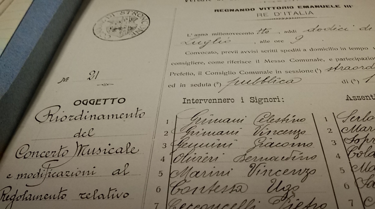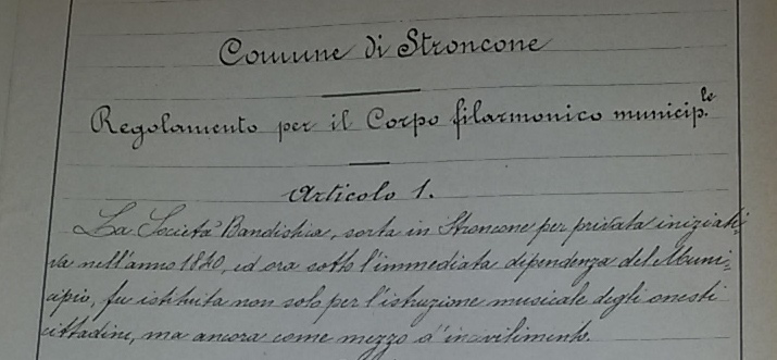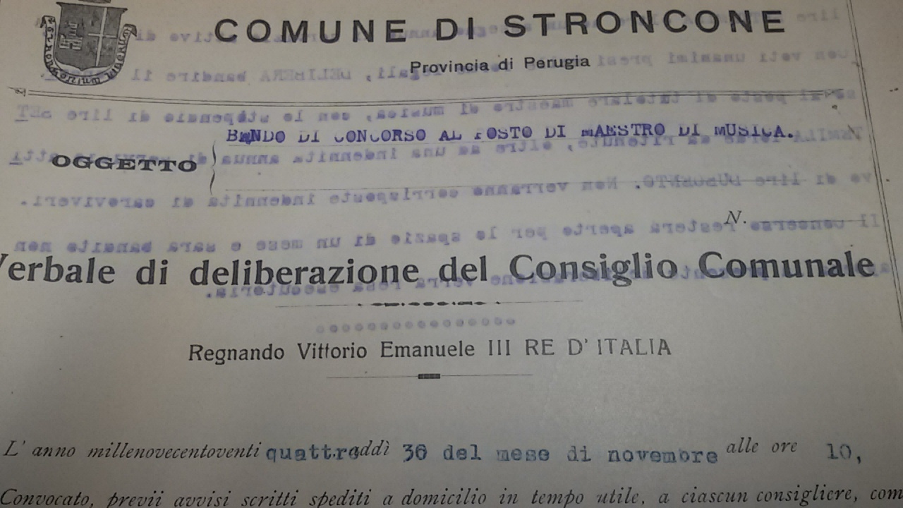 Il presente articolo riguarda il periodo che va dalla fine dell’800 al primissimo dopoguerra (1924). I documenti esaminati sono: Delibere comunali, relazioni, inventari, minute e atti ufficiali, capitolati di spesa e regolamenti che si sono susseguiti negli anni, aventi come unico scopo quello di mantenere il Corpo Filarmonico Comunale di Stroncone.