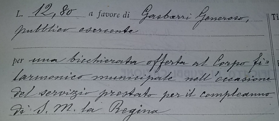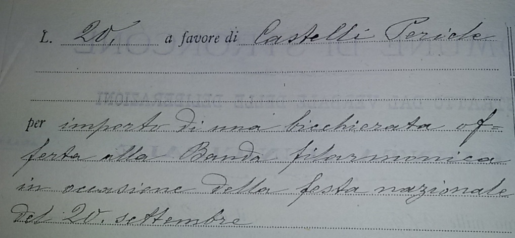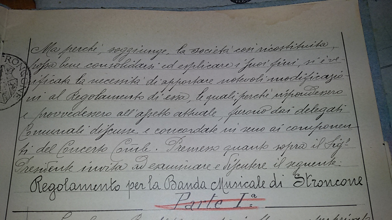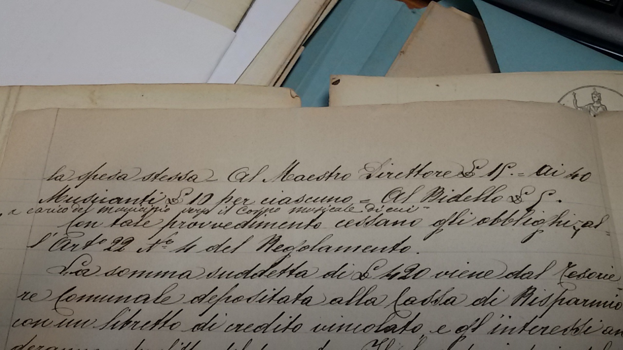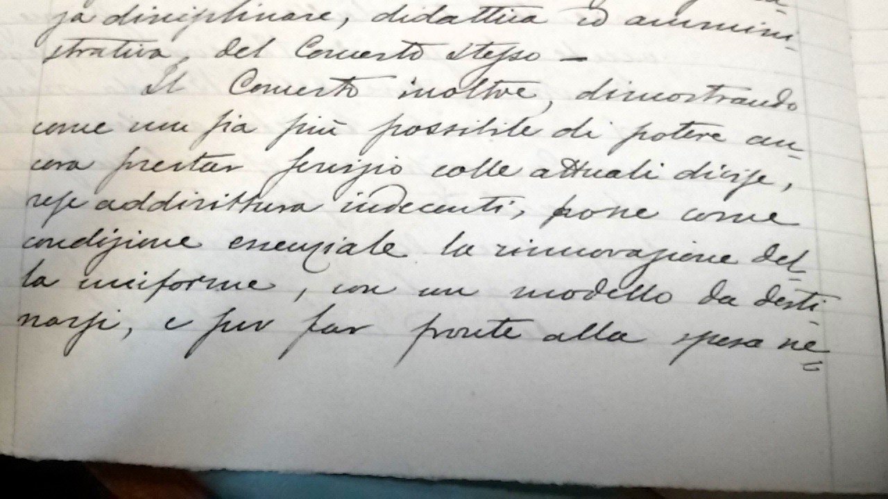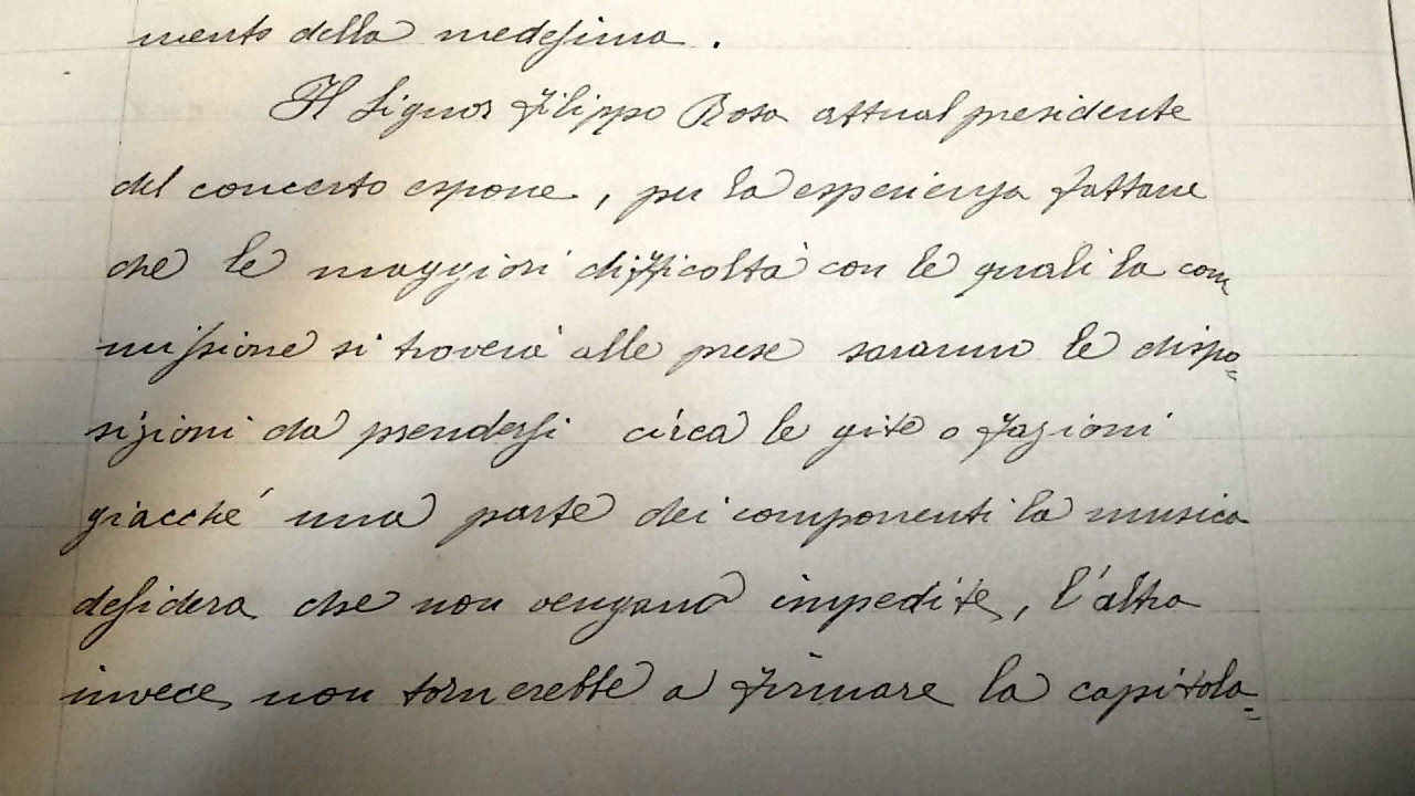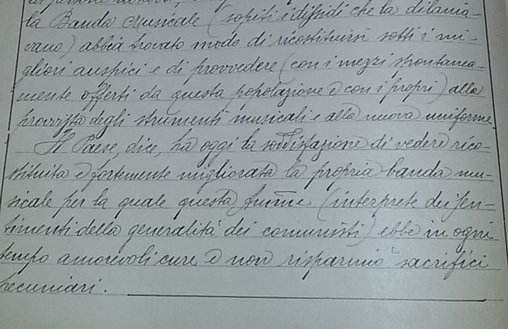 In essa, fa presente che se gli venisse tolta la Direzione della Banda, ciò causerebbe un: “grave danno per lo sviluppo delle tendenze artistiche e tecniche degli elementi del Concerto, con l’ interruzione degli esercizi graduali che in questo tempo ho avuto agio di iniziare”.