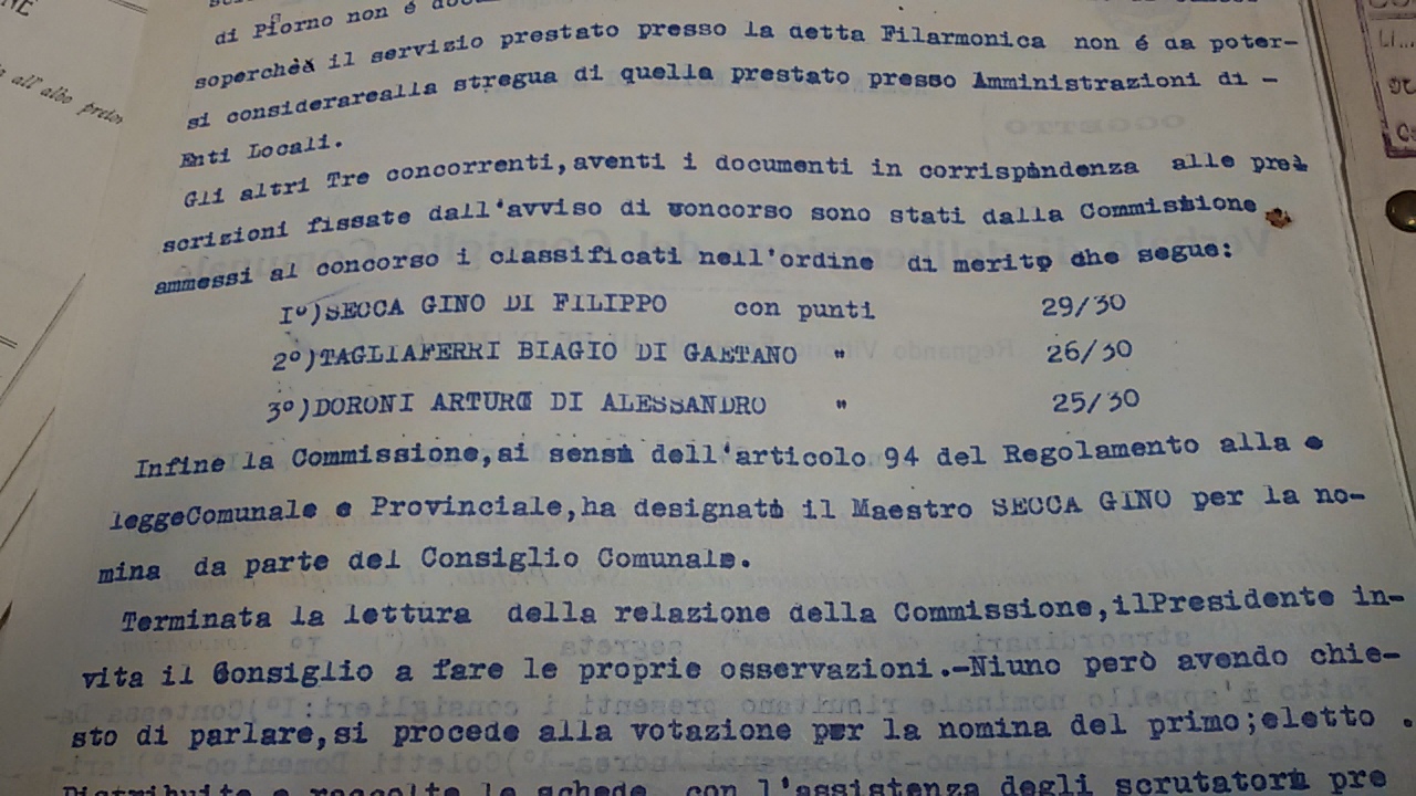 Ad esempio Secca Gino, che risulterà quello scelto e, che però, non prenderà servizio perché accetterà altro incarico, può vantare oltre ai vari diplomi di Composizione, Contrappunto, Direzione di banda ecc. Anche una serie di elogi e di encomi per le sue capacità artistiche, lodi di originalità e creatività nell’istruire parti, “drizzare vecchi musicanti e affinare i giovani iniziandoli all’esecuzione delle migliori opere italiane e straniere con squisito senso d’arte”
