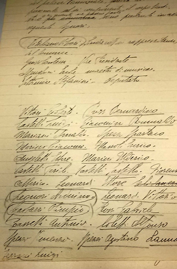 Intere generazioni si avvicendano nella formazione del corpo bandistico,” famiglie storiche” i cui cognomi si ripetono per oltre cinquant’anni: Massoli, Leonardi, Vittori, Spezzi, Rossi, Ferracci, Andrielli, Grimani, Castelli…