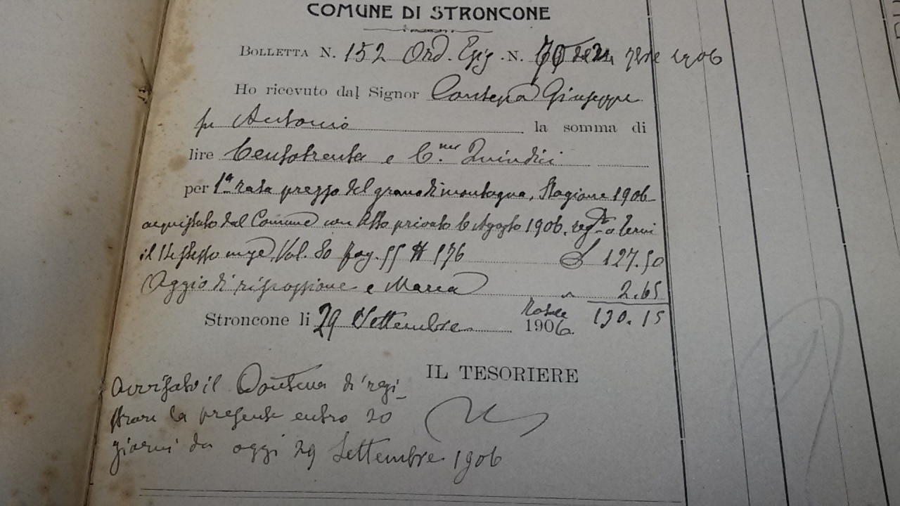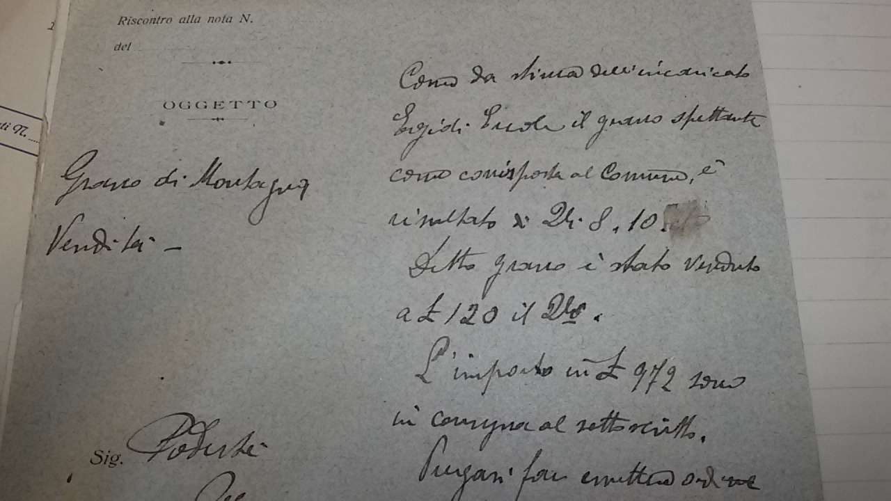 - Nel 1911, il grano raccolto sui beni di proprietà comunale, viene venduto a trattativa privata. Giuliano B. versa due rate: £ 787 e £ 335,25.