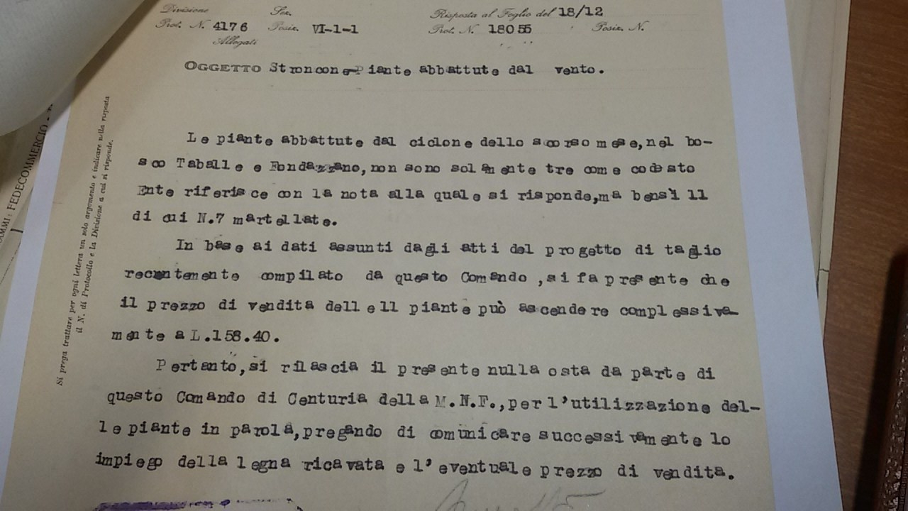 - tra le pratiche diverse: Asta taglio boschi Cesanto; bosco Pini; condotta consorziale forestale; taglio boschi Taballe e Fondazzano; domini collettivi; collaudo taglio bosco, taglio Macchia Riservata, taglio Valli Cimavalli.