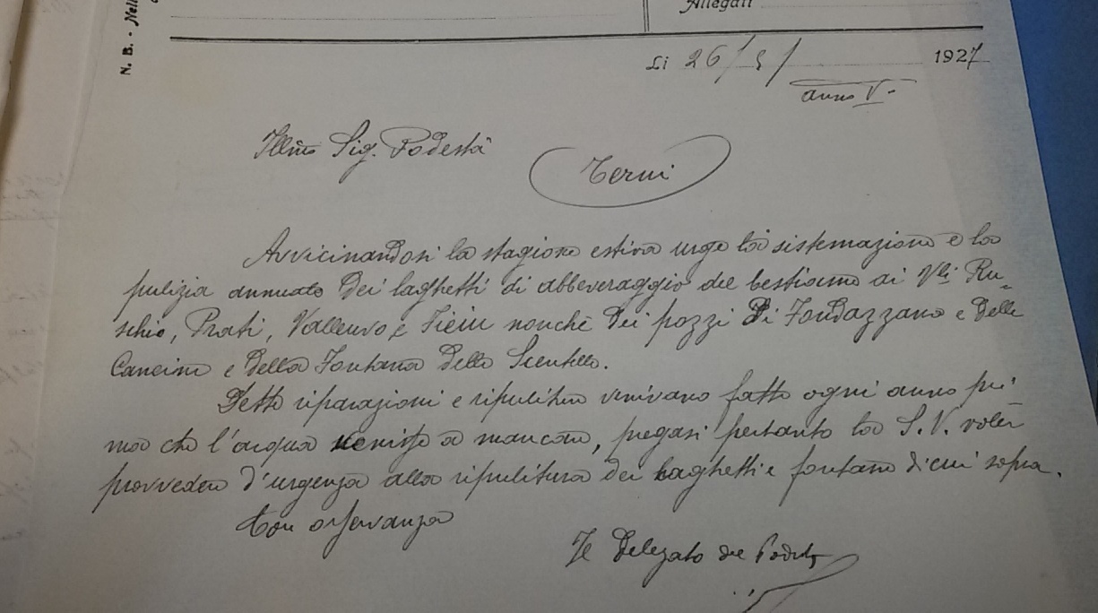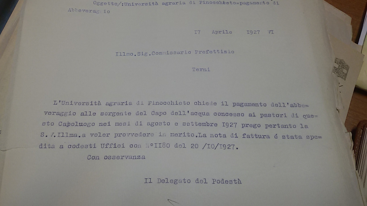 - l’acqua scarsa rende quasi impossibile abbeverare il numeroso bestiame, si chiede un accordo con l’Università Agraria di Finocchieto per ottenere che il bestiame da Stroncone possa recarsi per l'”abbeveraggio”, in quel territorio, in voc. Capo dell’acqua, come già nelle passate stagioni , previo pagamento;