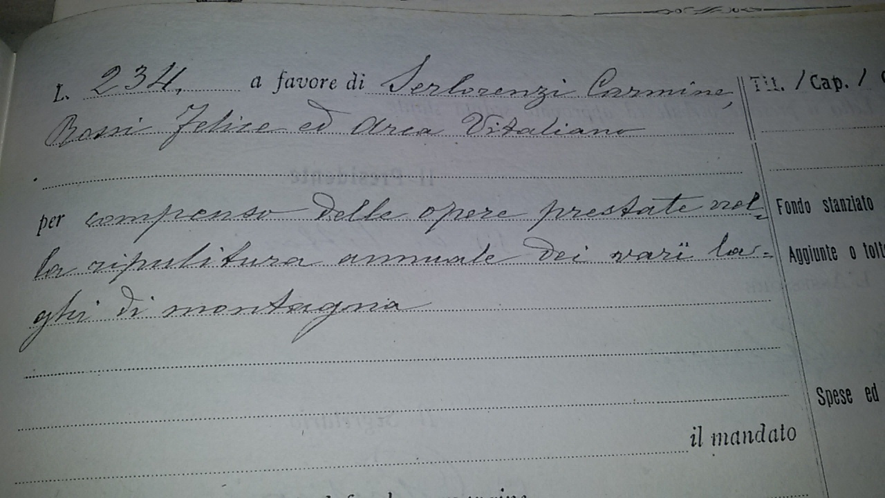 - a G. Generoso £ 18,20 per importo di vino consumato dagli operai che hanno assistito ai lavori di rilievo compiuti dall’Ispettore forestale nei tagliati boschi comunali.