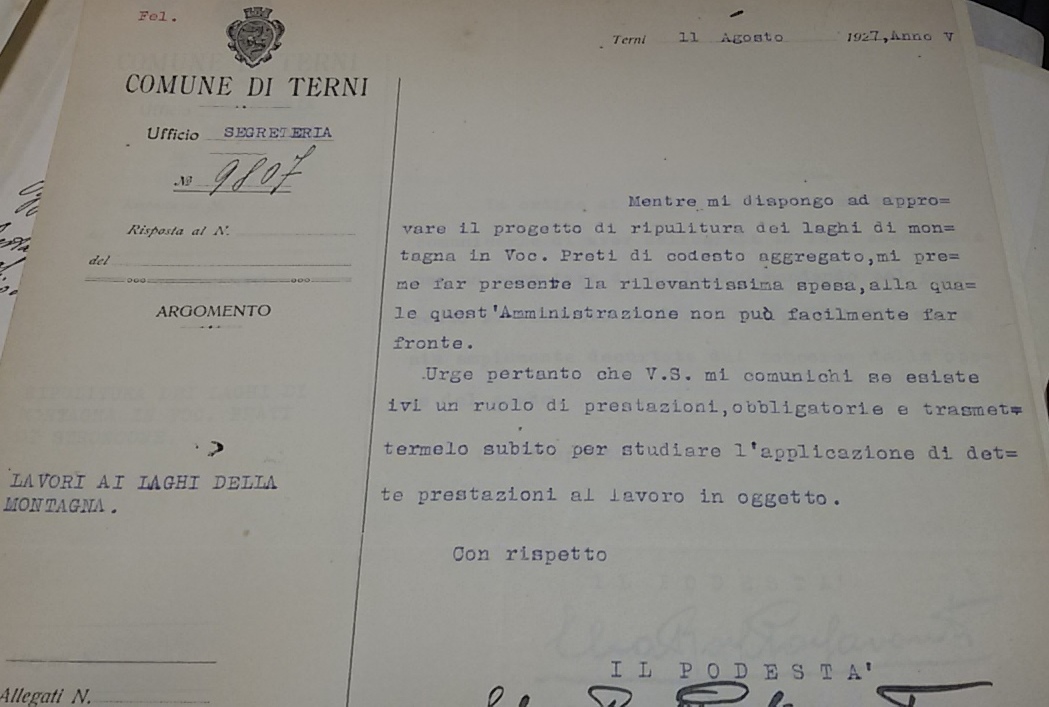 Ben se ne rende conto il Podestà di Terni, all’indomani dell’applicazione della Legge sull’aggregazione dei comuni, nel 1927. A maggio il delegato di Stroncone, avvisa che dovranno essere ripuliti i laghi di montagna