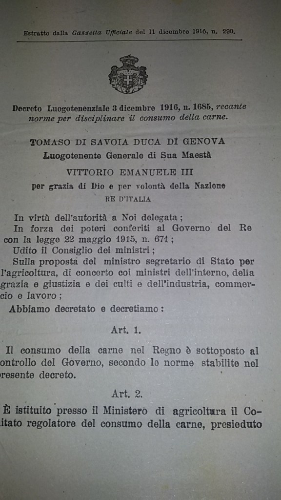 Lo sforzo bellico imponeva anche un razionamento delle risorse alimentari, in particolare della carne, per assicurare sia ai soldati che alla popolazione un sufficiente approvvigionamento .