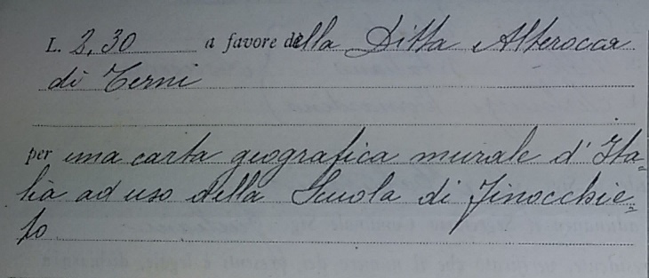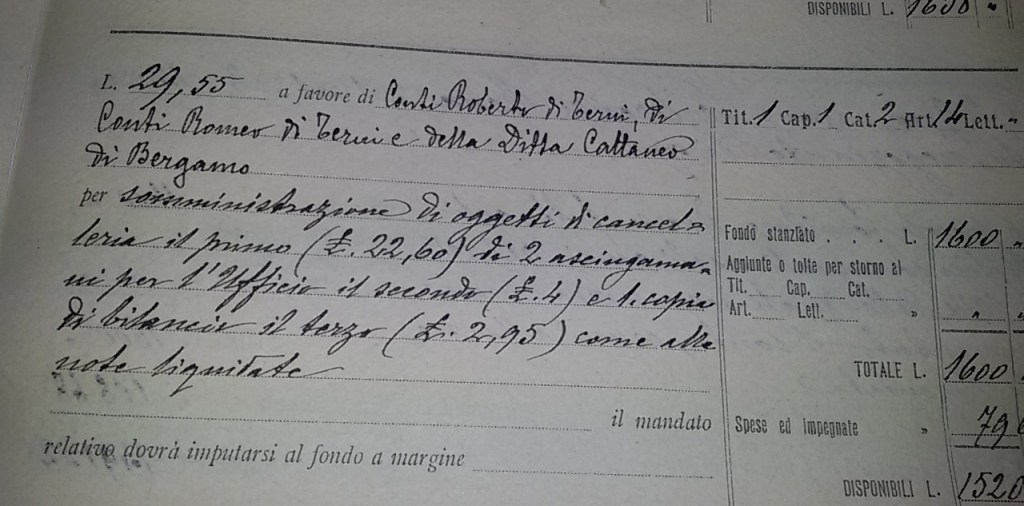 C’era, poi, il riscaldamento: legna e carbone, un approvvigionamento che richiedeva anche spese di trasporto. Trasporto da Terni, carbone necessario al riscaldamento degli Uffici Comunali £ 10,00; carbone acquistato da Roversi Luigi, negoziante di Terni, £ 37,00; legna da ardere per gli Uffici Comunali, pagata a Contessa Eugenio per £ 112,00.