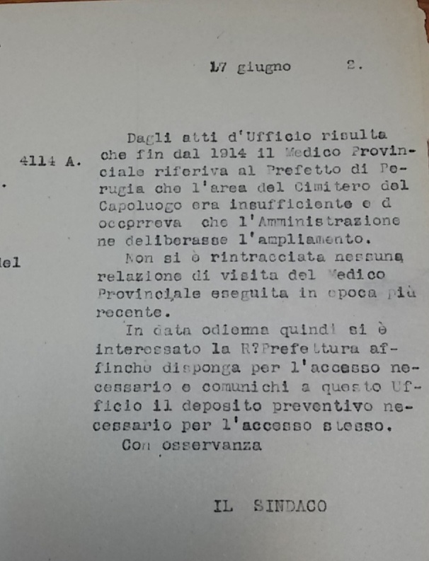 Nel 1914, una relazione del medico Provinciale aveva dichiarato:”le fosse del capoluogo sono state scavate poco in profondità, perché il custode, che è il superiore del Convento, non ha sorvegliato l’operaio. L’area del cimitero è insufficiente ed è stata abolita la fossa carnaria sotto alla cappella del Cimitero. Il Comune ha 5 cimiteri ( Capoluogo, Coppe, Finocchieto, Vasciano, Aguzzo) tutti in pessime condizioni”. La situazione appare talmente grave che, la perizia, si chiude con la proposta di concentrare più sepolture nel capoluogo e abolirne alcuni delle frazioni, facendo accordi con i comuni limitrofi ( Narni e Configni).