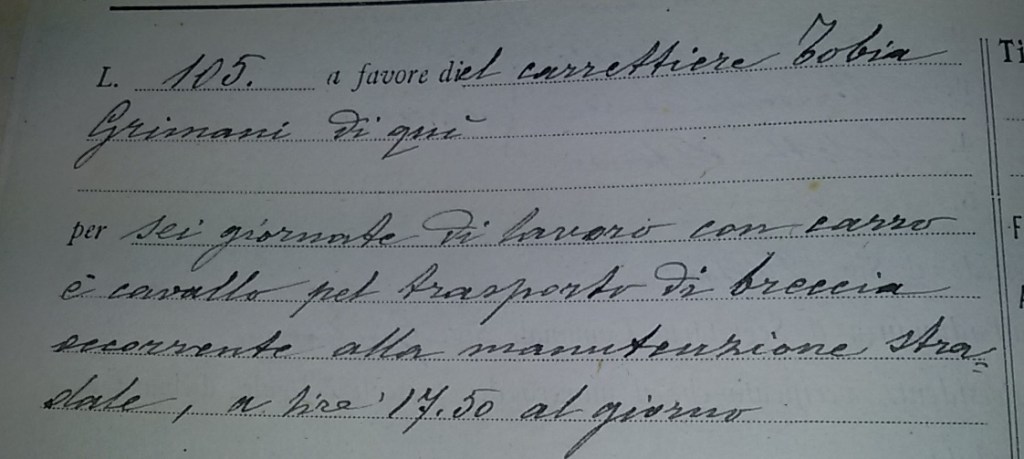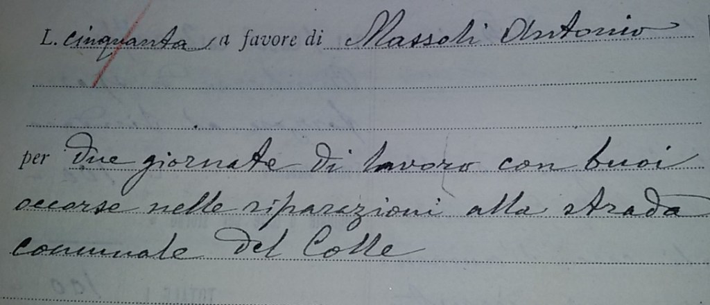 Per l’imbrecciatura della strada di Colle vengono pagate a Massoli Antonio, due giornate di lavoro con i buoi; per quella di Aguzzo al carrettiere Tobia