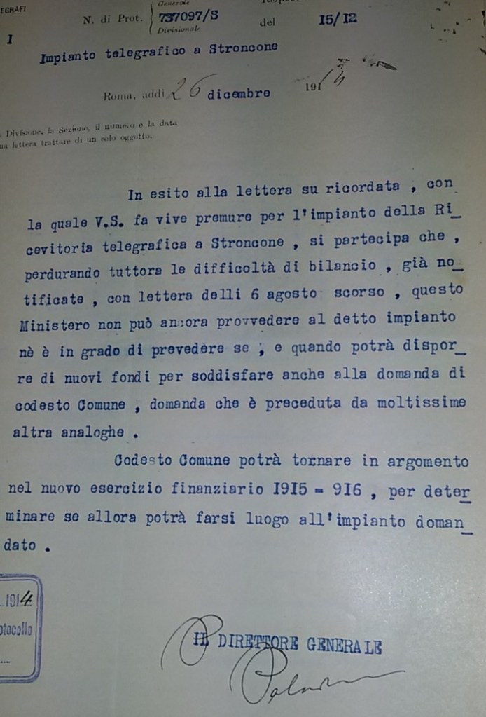 Sul fronte nuovi Progetti fu un periodo di pieno fermento. Già dal 1914 venne fatta la richiesta per avere un ufficio telegrafico che vide il coinvolgimento anche del deputato Faustini e del Ministro Giuffrida. Alterne vicende di ordine finanziario portarono all’inaugurazione solo nel 1921. Era una richiesta che accomunava Stroncone, ad altri comuni che, però, non ebbe immediata soddisfazione.
