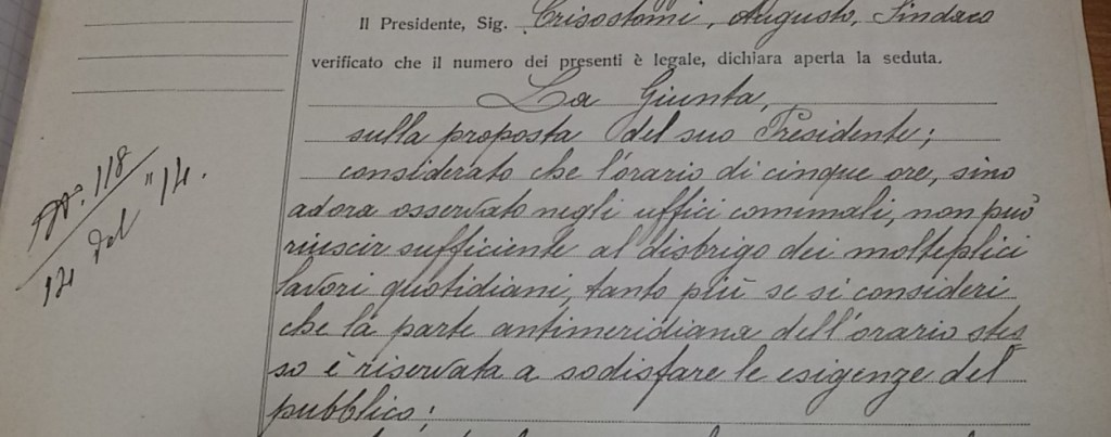 Nel 1914, il Comune era in piena attività di riforma: vennero modificati gli orari dell’ufficio perché non rispondenti più alle nuove esigenze della popolazione.