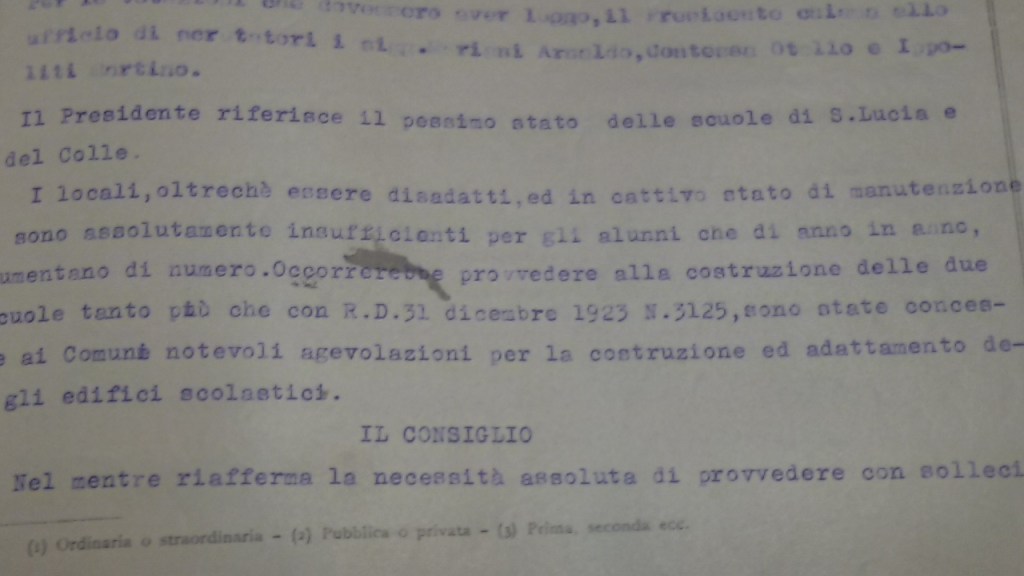 Il 31 agosto del 1922, il Direttore delle scuole, Napolitano scriveva al Sindaco per richiedere la manutenzione di alcune scuole del territorio. “ Le aule scolastiche durante il periodo delle vacanze autunnali dovranno essere disinfettate. Bisogna far costruire nuovi banchi per almeno 50 scolari. La scuola di Colle, una delle più frequentate e popolose delle nostre rurali, per la sua ampiezza con una piccola finestrina, è circondata da stalle dalle quali non emana che aria insalubre, è inadatta. Bisogna riparare d’urgenza il tetto dell’aula della scuola di Coppe; imbiancare la scuola di Vascigliano e cambiare i vetri. L’aula della scuola di Santa Lucia è angusta per 60 bambini delle 2 e 3 classi riunite; nelle scuole di Vasciano e Finocchieto vanno riparati il tetto e il pavimento. Nel Capoluogo va riparato il pavimento, dove i bambini inciampano” .