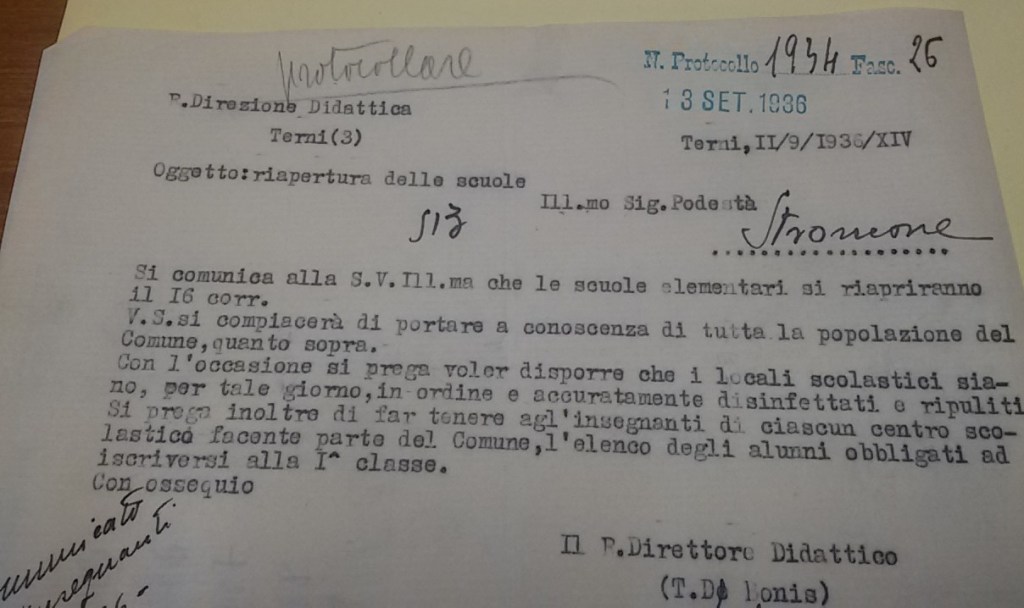 Un richiamo alla pulizia e disinfezione che verrà fatto più volte e comunque alla fine di ogni anno scolastico, come dimostra anche il documento del 1936 del Direttore De Bonis, inviato al Podestà per comunicare la riapertura delle scuole.