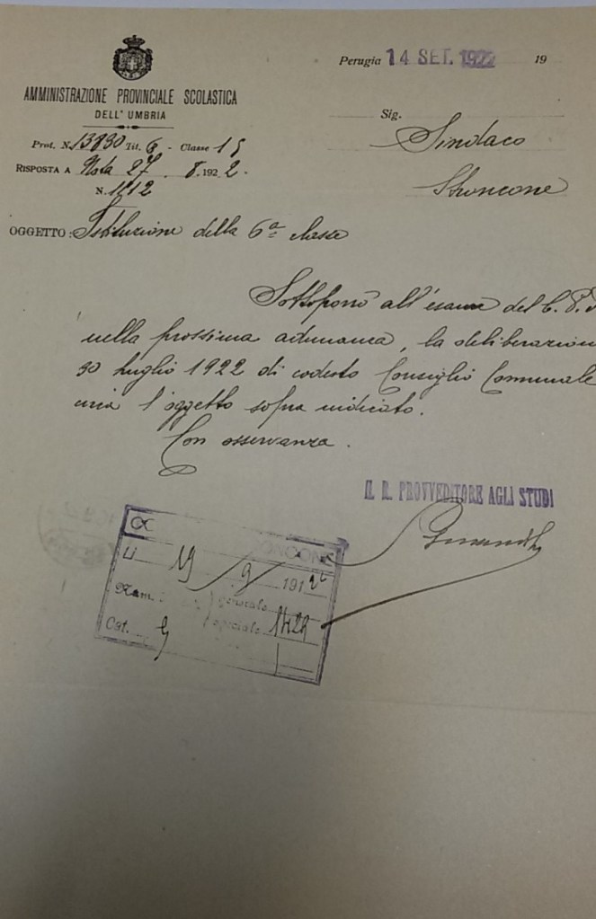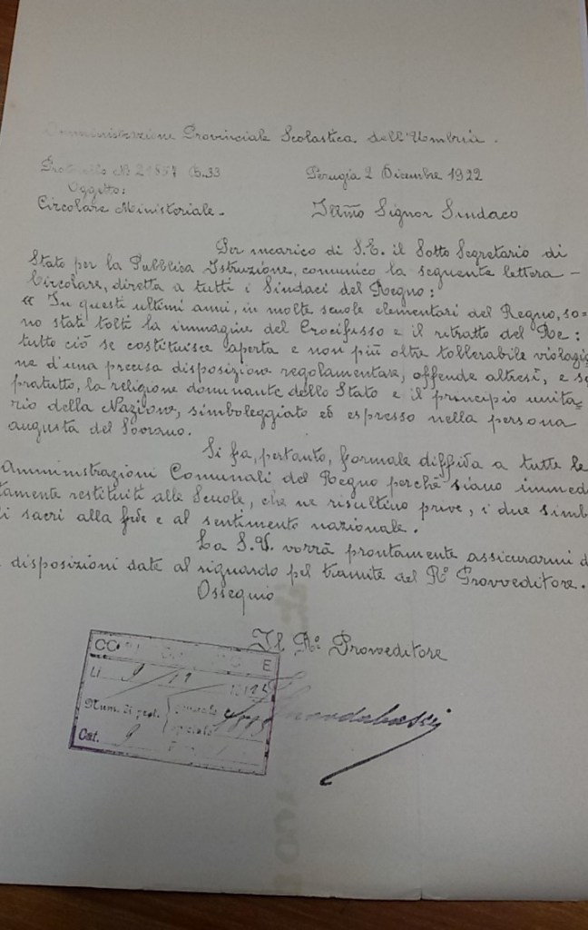 Il 2 novembre 1922, L’amministrazione Provinciale Scolastica, richiamava al mantenimento nelle scuole del Crocefisso e del ritratto del Re. “Il toglierli è violazione di una precisa disposizione regolamentare e offende la religione dominante dello Stato e il principio unitario della Nazione simboleggiata ed espresso nella Persona Augusta del Sovrano” . I Sindaci dovevano vigilare affinchè fossero ben visibili nelle scuole.
