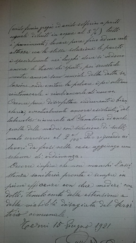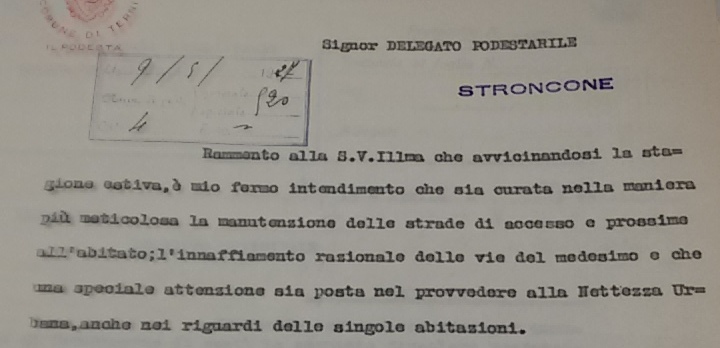 Negli stessi anni, il documento è del luglio 1896, anche a Stroncone, l’Ufficiale sanitario reclamava lo stato deplorevole a livello igienico del comune e così scriveva:” in questa stagione il paese dovrebbe essere spazzato due volte alla settimana ma la nettezza e la disinfezione dovrebbero essere tutti i giorni costantemente e principalmente nei vicoli dove si raccolgono immondizie di ogni genere. E’ necessario un aumento di personale per tutto ciò. Il condotto dell’acqua potabile è malandato, l’acqua stessa viene inquinata, la poca cura delle stalle, delle latrine pubbliche e dei vicoli, ove più che in altri luoghi si annidano le materie di rifiuto è grandemente trascurato”