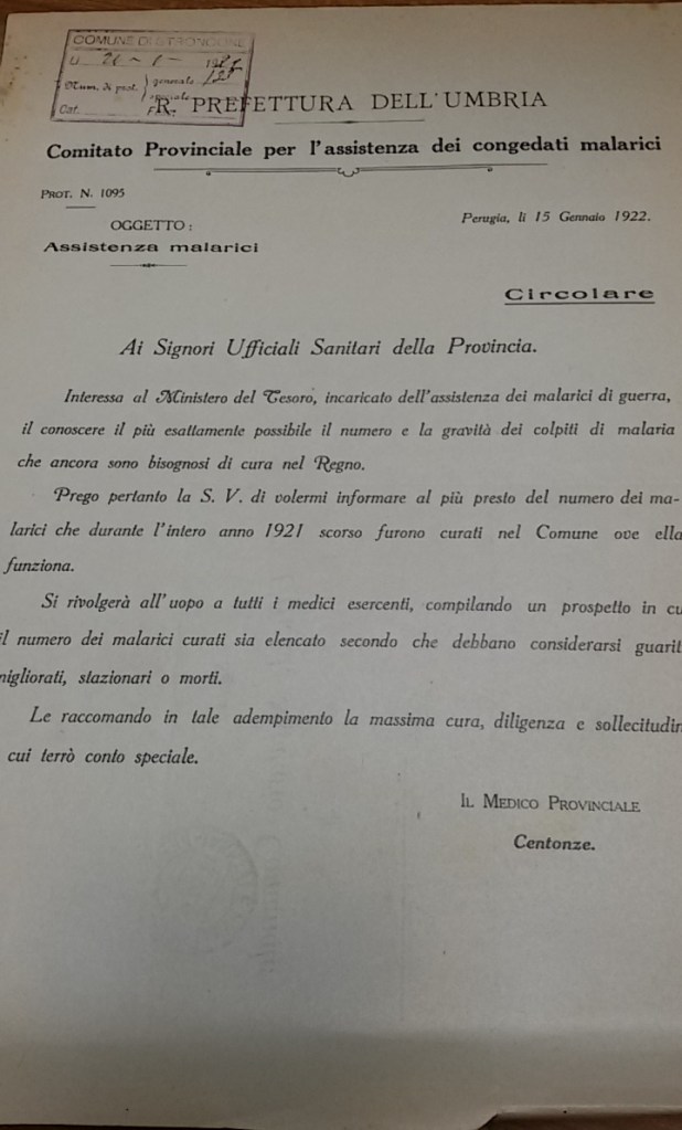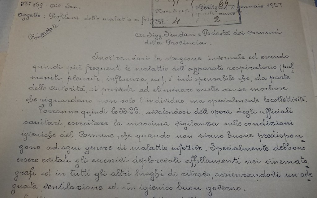 Erano così temute che lo stesso governo emanava decreti e raccomandazioni anche attraverso telegrammi affinchè gli amministratori attuassero una corretta profilassi. Nel 1922, a causa dell’estate particolarmente calda, si raccomandavano indicazioni sanitarie come:“profilassi infettiva verso gli animali in piena efficienza; disinfezione periodica a brevi intervalli acqua potabile zona protezione serbatoi percorso conduttura, incaricando persone responsabili di ispezionare mulini, pastifici e depositi cereali di provenienza estera; necessario aver pronto locale isolamento personale, adatto materiale disinfezione; denuncia qualsiasi caso anche sospetto malattia infetta intestinale, febbre acuta, ghiandole ascellari e inguinali, senza creare allarmismi. La denuncia deve avvenire per telegramma”