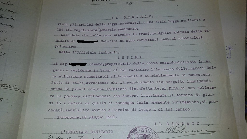 Sul finire del 1800, venne scoperta la contagiosità della tubercolosi e dunque la legislazione si occupò di creare strutture idonee per accogliere i malati. Vennero creati reparti di isolamento ed emanate disposizioni per contrastare il contagio negli ospedali, negli opifici e in altri luoghi di lavoro. “i malati e i morti di tubercolosi, in una casa che non viene risanata igienicamente continueranno a contagiare quelli che vi abiteranno nuovamente”. Negli anni della Grande Guerra, furono rimpatriati migliaia di prigionieri dai campi austriaci perchè colpiti da tale malattia. Fu il caso che si verificò nella frazione di Aguzzo nel 1921, per il figlio di Sabatino M., come confermò l’ufficiale sanitario: “congedato tubercolotico già prigioniero di guerra in Austria e che giace nel sanatorio di Roma a soli 22 anni. Tutta la famiglia risulta contagiata perciò abbisogna di un sussidio per raschiare l’intonaco e rimbiancare disinfettando e curarsi con medicine, assistenza e buon cibo”