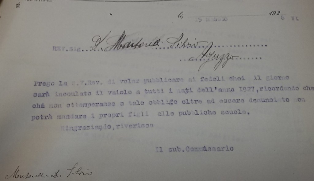 Nel novembre del 1925, un telegramma del Governo, avvertì tutti gli Ufficiali sanitari di stare in allerta per manifestazioni di vaiolo nel bacino del Mediterraneo e da altri paesi europei. Si temeva la diffusione del morbo nel Regno.” Particolare cura dovrà darsi al servizio vaccinazioni antivaiolose sessione autunnale per avere sicurezza che nessuno sfugga dall’obbligo sancito. Dato poi l’inizio dell’anno scolstico si deve procedere rigorosamente al controllo dello stato di vaccinazione degli alunni secondo la legge che prevede l’obbligo di vaccinazione all’ottavo anno di età”